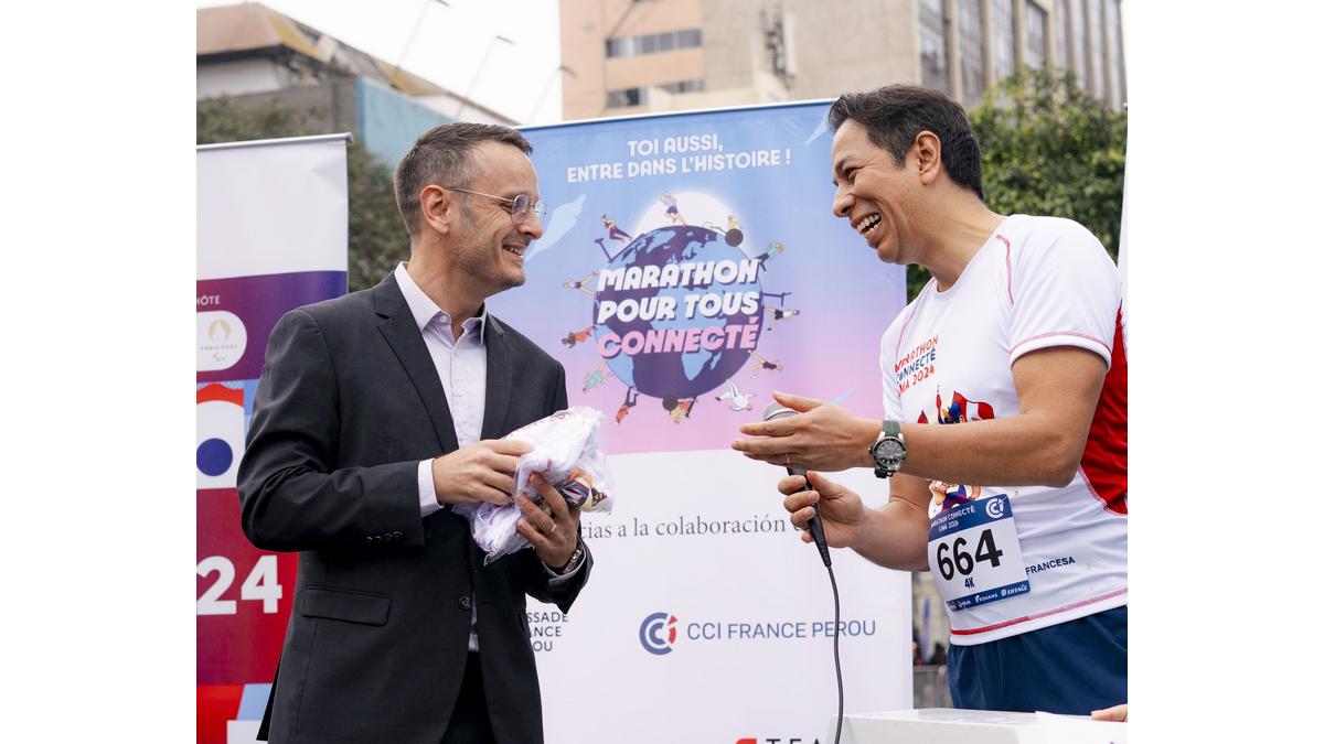 El domingo pasado, la Cámara de Comercio e Industria Peruano-Francesa (CCIPF) organizó con gran éxito la Marathon Pour Tous Connecté en colaboración con la Embajada de Francia, la Municipalidad de Miraflores y con el apoyo de las empresas Equans Perú, Veolia, Sodexo y Eiffage. Este evento se desarrolló en el contexto de los recientes Juegos Olímpicos de París 2024, promoviendo el deporte y un estilo de vida saludable entre el público.