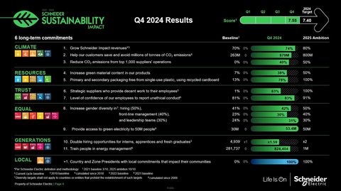 Para obtener más información sobre el programa de Impacto en la Sostenibilidad de Schneider, consulte el informe del cuarto trimestre o de todo el año 2024 de Schneider, que incluye un tablero detallado del progreso alcanzado.