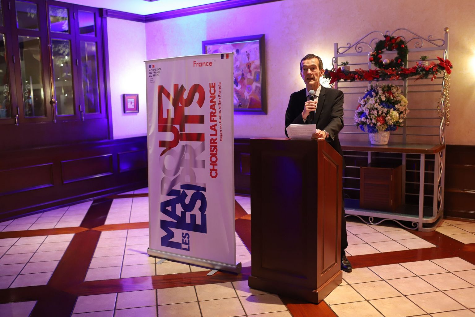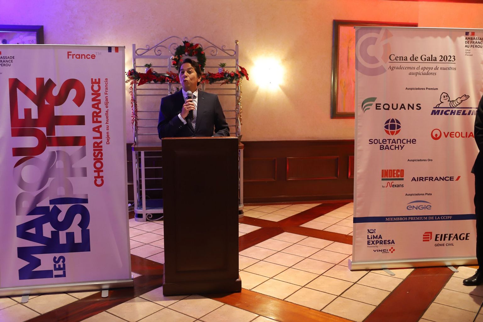 de Francia, Marc Giacomini, y el Presidente de la CCIPF, Ricardo Guevara Bringas. Este último puso de relieve el gran impacto de las empresas francesas en su contribución al desarrollo durable en el Perú, en los sectores de energía, tratamiento de residuos, aeronáutico, alimentación, y otros. Recalcó que este impacto positivo expresa la confianza de las empresas francesas en el Perú, ya que la confianza es apostar en el futuro. Precisó además que la incertidumbre nos pone a prueba, y nos hace más creativos y flexibles.