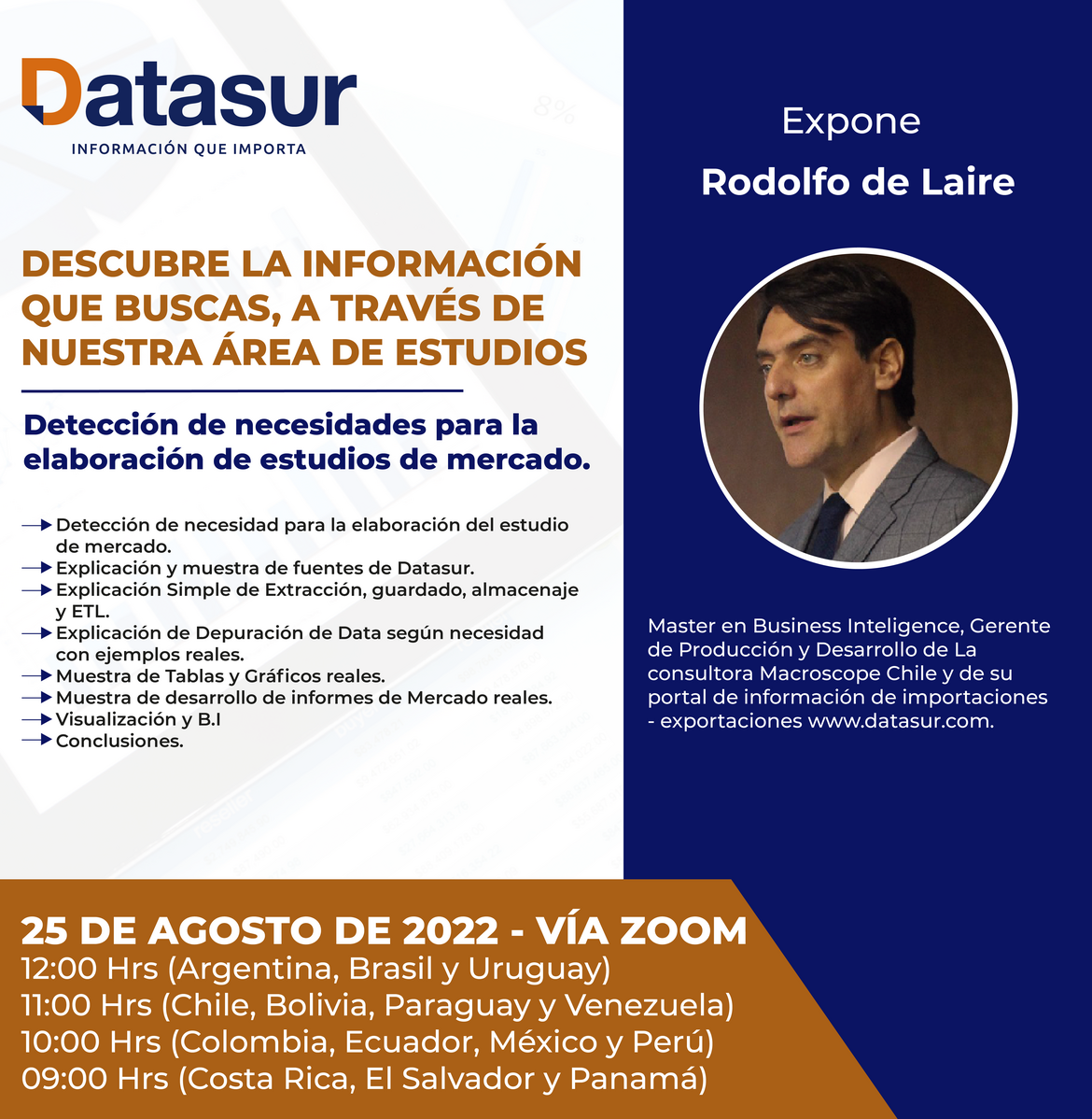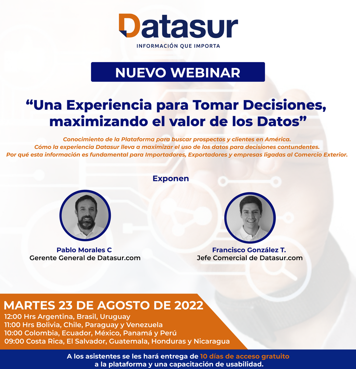 Este 23 de agosto Pablo Morales, Gerente General y Francisco González Jefe Comercial te presentarán Datasur.com, a través del conocimiento de la plataforma para buscar prospectos y clientes, junto con la maximización del uso de los datos para la toma de tus decisiones y mucho más!