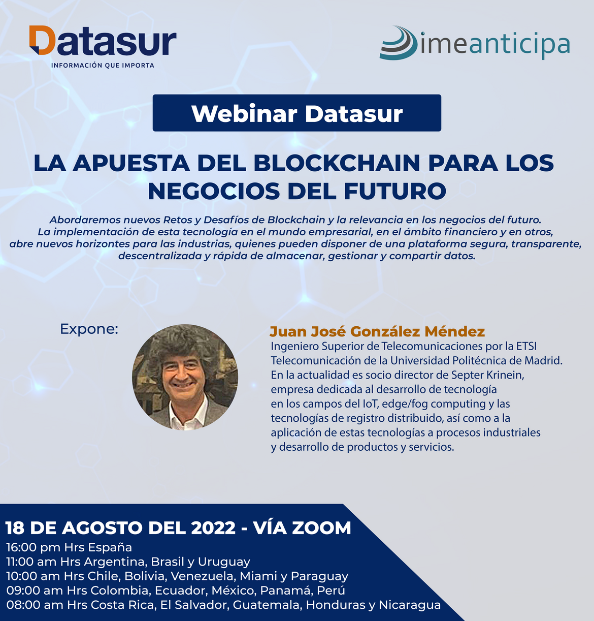 Conoce las oportunidades que el Blockchain puede entregarle a tu negocio en un nuevo webinar gratuito organizado por Datasur.com, en el cual descubrirás los nuevos retos y desafíos de esta herramienta, junto con la implementación en el mundo empresarial, financiero y mucho más.