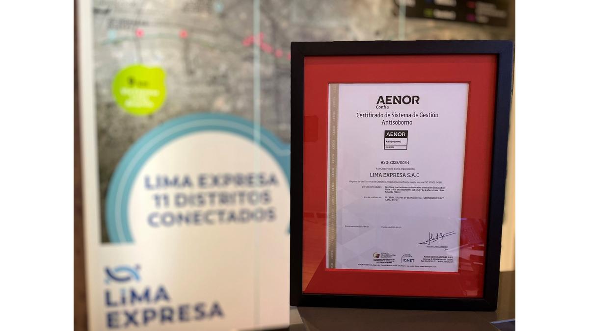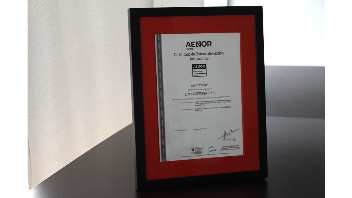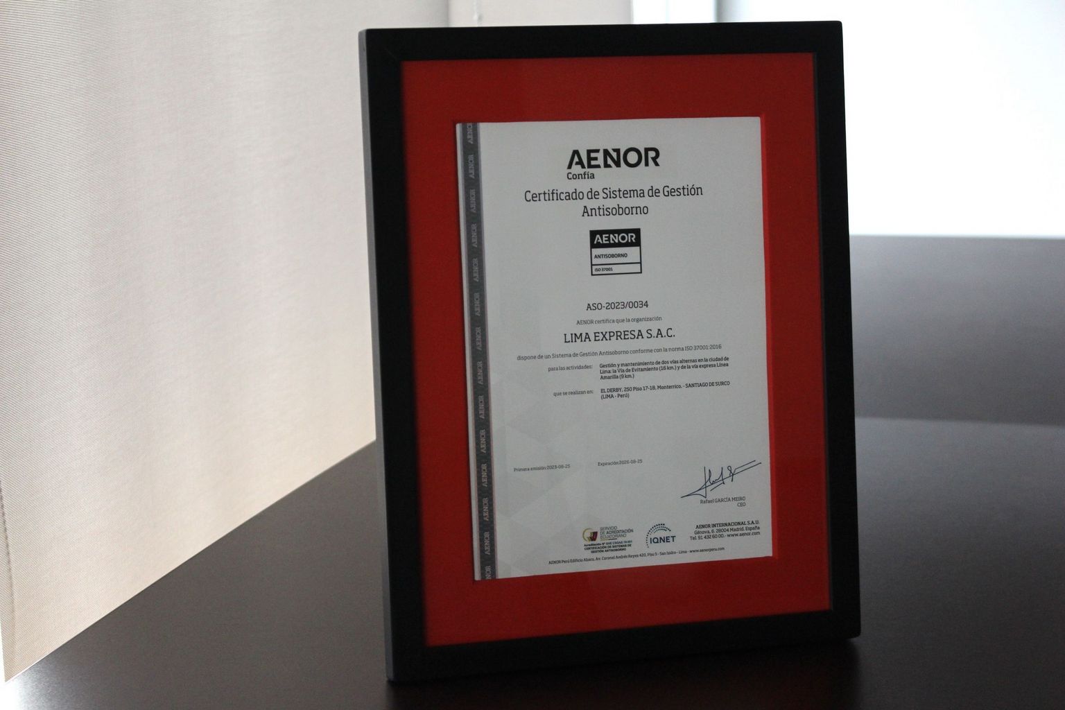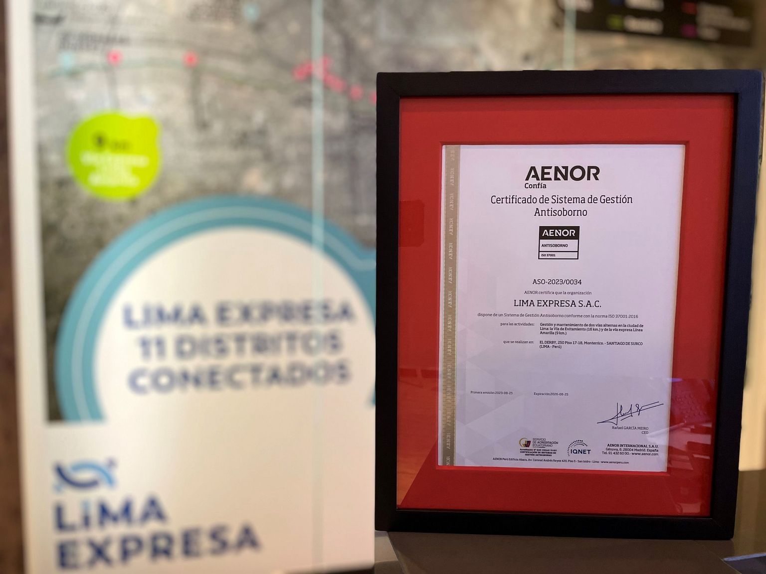 ISO 37001 es el estándar internacional que especifica los requisitos y proporciona una guía para establecer, implementar, mantener, revisar y mejorar un sistema de gestión antisoborno. Este es un estándar que puede ser validado y auditado por un tercero, y sólo obtienen la certificación aquellas organizaciones que demuestren que su gestión cumple con los requisitos. La certificación ISO 37001 de LIMA EXPRESA fue entregada por un tercero independiente, experto y reconocido, AENOR.