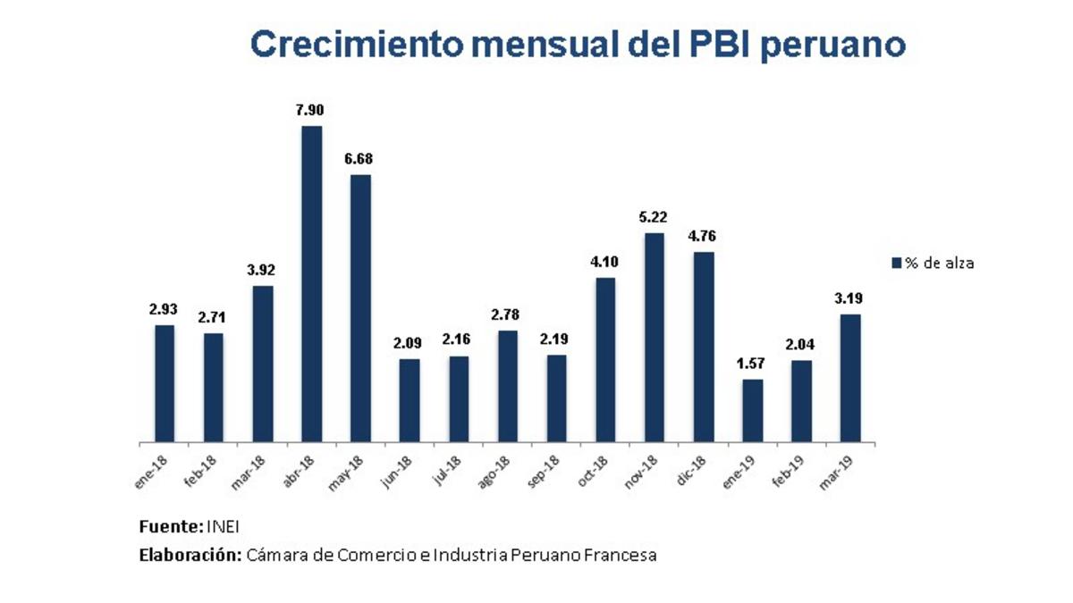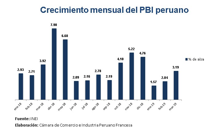 El Instituto Nacional de Informática y Estadística (INEI) publicó las cifras relativas al crecimiento del Producto Bruto Interno peruano, para el periodo enero-marzo 2019. En enero el alza fue moderado (+1,57% en comparación con enero 2018), pero las cifras de febrero (+2,04%) y sobre todo marzo (+3,19%) permitieron un aumento general del 2,27% en el PBI peruano, en comparación con el primer trimestre del año pasado.
