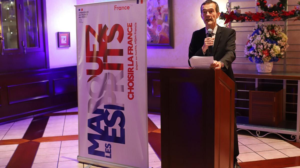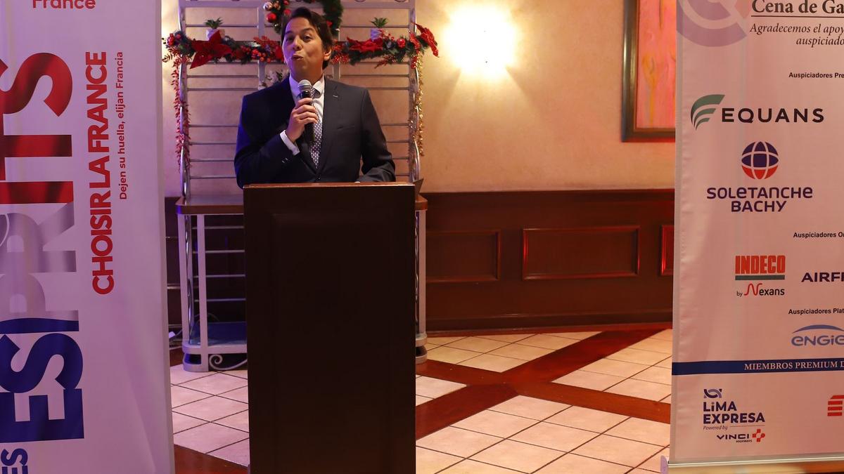 de Francia, Marc Giacomini, y el Presidente de la CCIPF, Ricardo Guevara Bringas. Este último puso de relieve el gran impacto de las empresas francesas en su contribución al desarrollo durable en el Perú, en los sectores de energía, tratamiento de residuos, aeronáutico, alimentación, y otros. Recalcó que este impacto positivo expresa la confianza de las empresas francesas en el Perú, ya que la confianza es apostar en el futuro. Precisó además que la incertidumbre nos pone a prueba, y nos hace más creativos y flexibles.