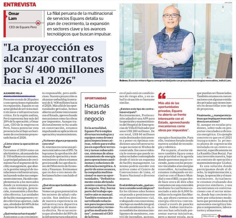 El Perú representa más del 20% de la operación regional y la empresa proyecta sumar S/400 millones en contratos al 2026.