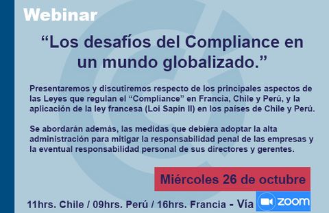 Se presentará y discutirá respecto de los principales aspectos de las Leyes que regulan el “Compliance” en Francia, Chile y Perú, y la aplicación de la ley francesa (Loi Sapin II) en los países de Chile y Perú. Se abordarán además, las medidas que debiera adoptar la alta administración para mitigar la responsabilidad penal de las empresas y la eventual responsabilidad personal de sus directores y gerentes.
