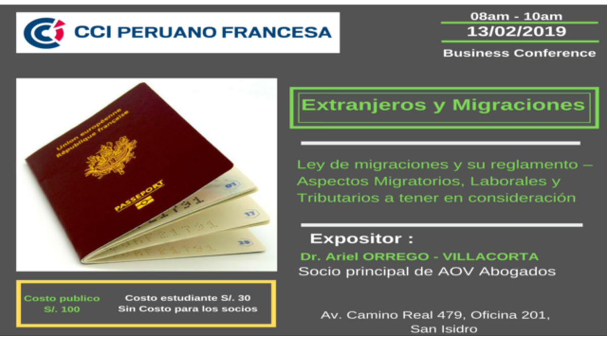 Pour la première conférence de l'année, Ariel Orrego Villacorta (AOV Abogados) discutera des aspects importants concernant le droit de la migration, ses principes, ses procédures, ses amendements et autres considérations dans le cadre du travail et de la finance d'entreprise.