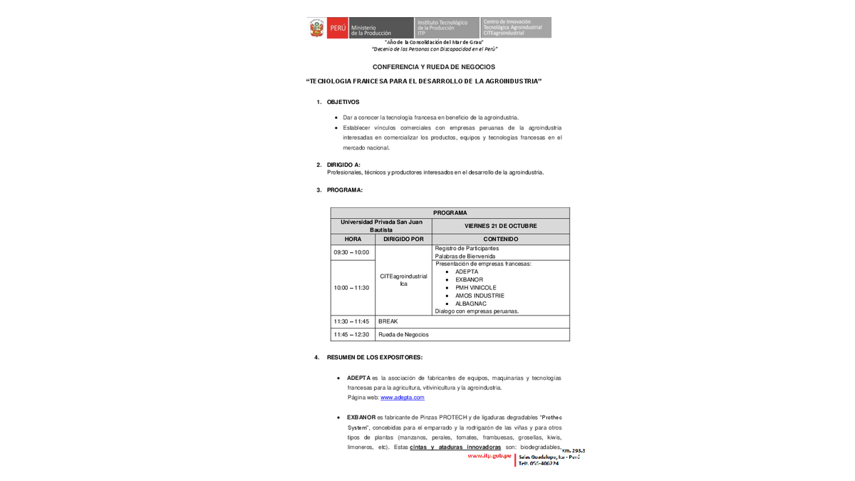 La Chambre de Commerce et d'Industrie franco-péruvienne, avec le soutien du CITEagroindustrial Ica et l'Adepta, coorganise une conférence à Ica sur le thème : Technologie francaise pour le développement de l'Agroindustrie.