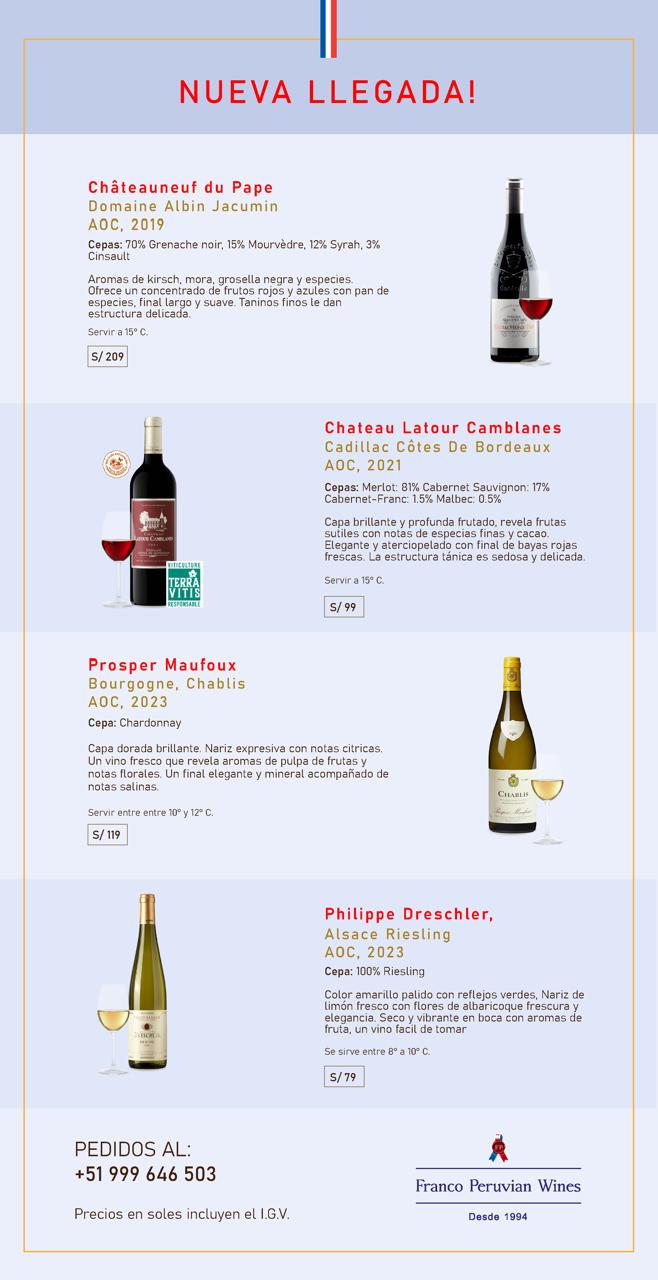 Présente au Pérou depuis 1994, Franco Peruvian importe des vins français de Bourgogne, d’Alsace, de la Vallée de la Loire, des rosés de Provence, des Côtes du Rhône ainsi que quelques-uns des meilleurs Grands crus de Bordeaux. Depuis plus de 30 ans, elle importe également des cornichons, des moutardes, des fromages et des escargots de Bourgogne. Parmi ses clients figurent notamment la chaîne Relais & Châteaux et les hôtels du groupe Accor. Ses vins sont présents dans les cartes de restaurants à travers tout le pays.