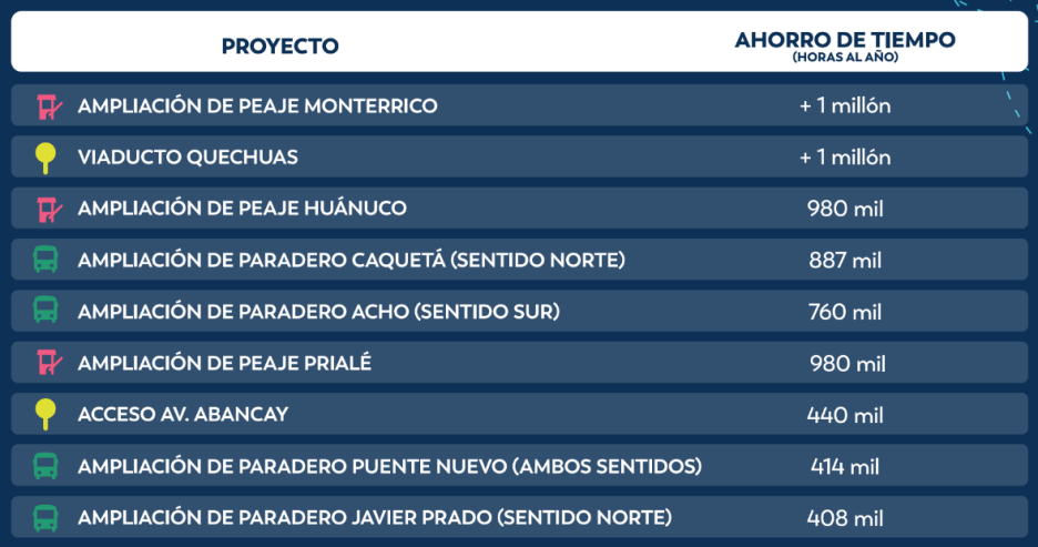 En outre, le plan comprend la construction du viaduc Quechuas, qui améliorera la connexion entre l’Av. Quechuas et l’Av. Palmeras, ainsi que l’optimisation de l’accès à l’Av. Abancay, afin d’éviter la formation de files d’attente sur la Vía de Evitamiento.