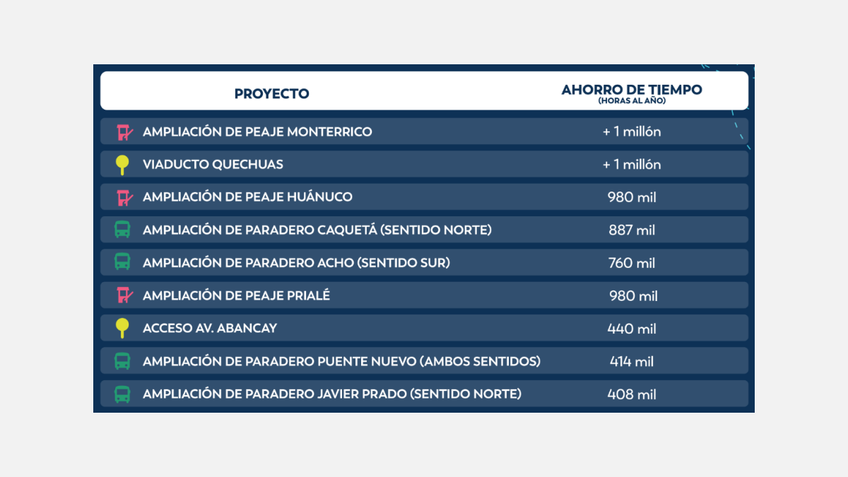 Parmi les principales interventions, on note l’expansion des péages de Monterrico, Huánuco et Prialé, où de longues files d’attente affectent actuellement la fluidité du trafic. De plus, le projet prévoit la relocalisation et l’agrandissement des arrêts de bus dans des points stratégiques comme Caquetá, Acho et Puente Nuevo, facilitant ainsi l’opérabilité des transports publics et réduisant la congestion sur les axes principaux.
